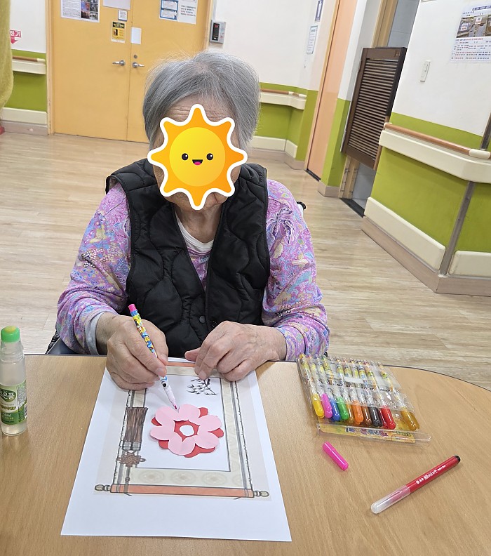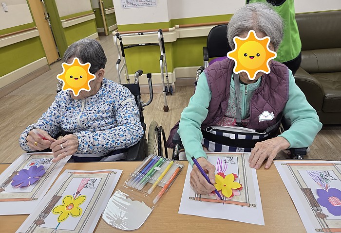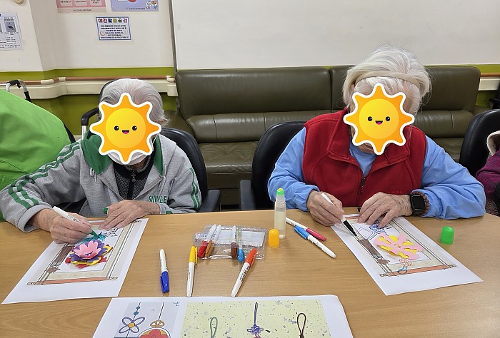 어르신들 작품을 층 게시판에 장식해 두니 생활실이 갤러리가 되었습니다.