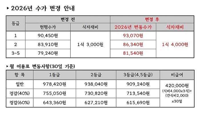 2026년 장기요양 수가변경 안내 페이지 정보 작성자 관리자 작성일26-01-02 10:56 조회303회 댓글0건 다음글 목록 본문 2026년 수가변경 안내 드립니다. 댓글목록 등록된 댓글이 없습니다. 다음글 목록